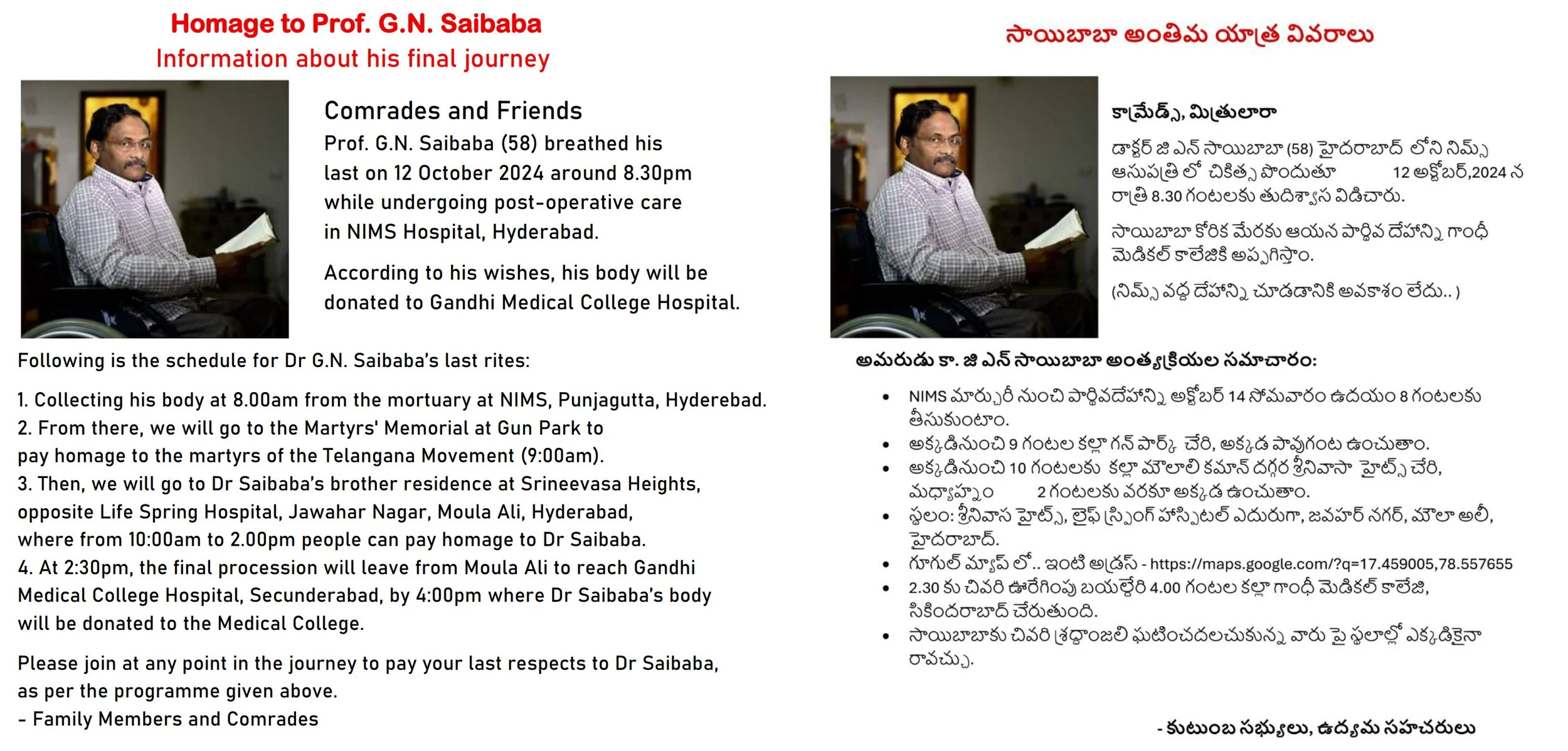 N9 Media’s video coverage of the Gun Park rally on 14 October 2024, as part of Dr G.N. Saibaba’s final journey.