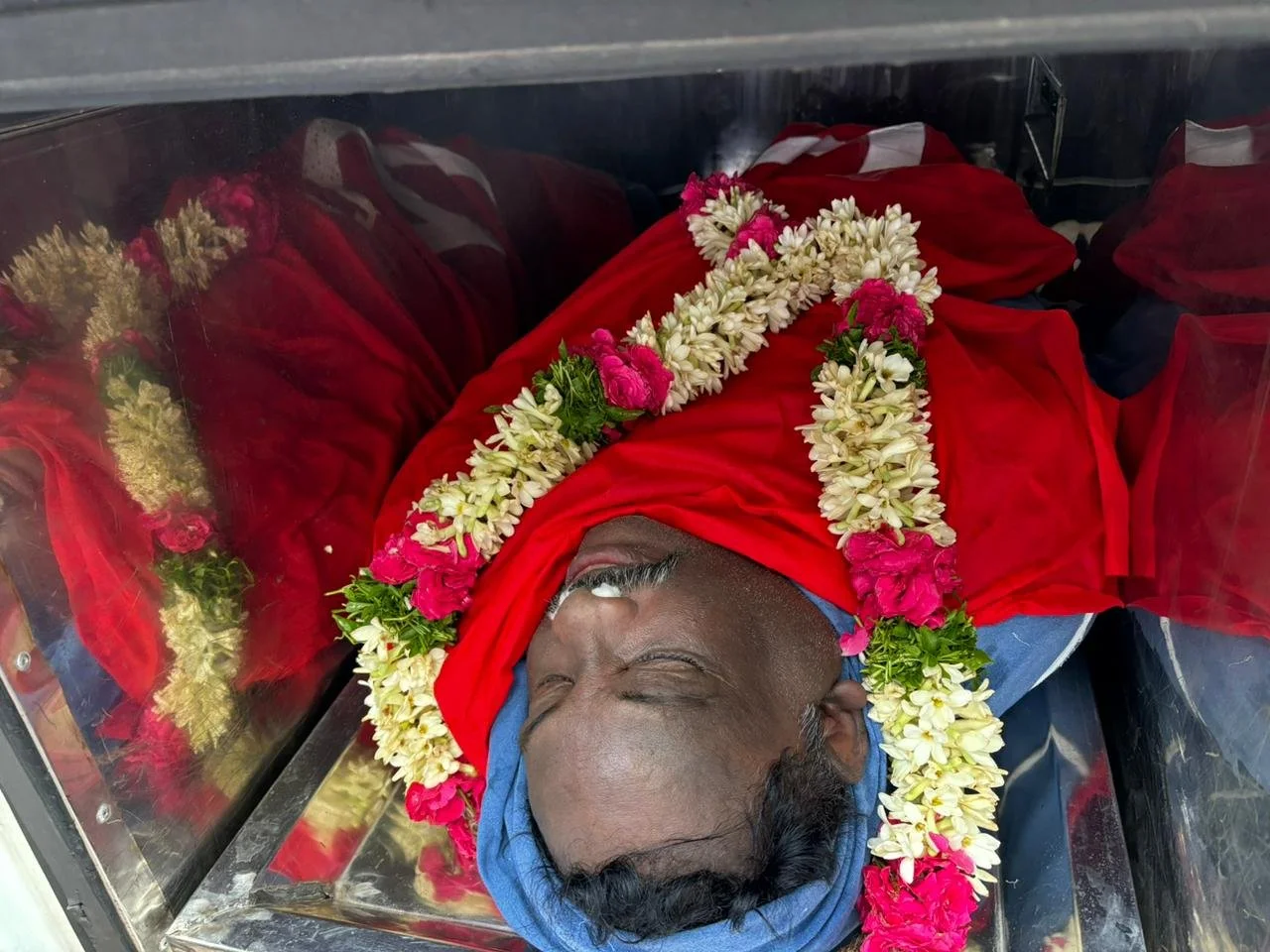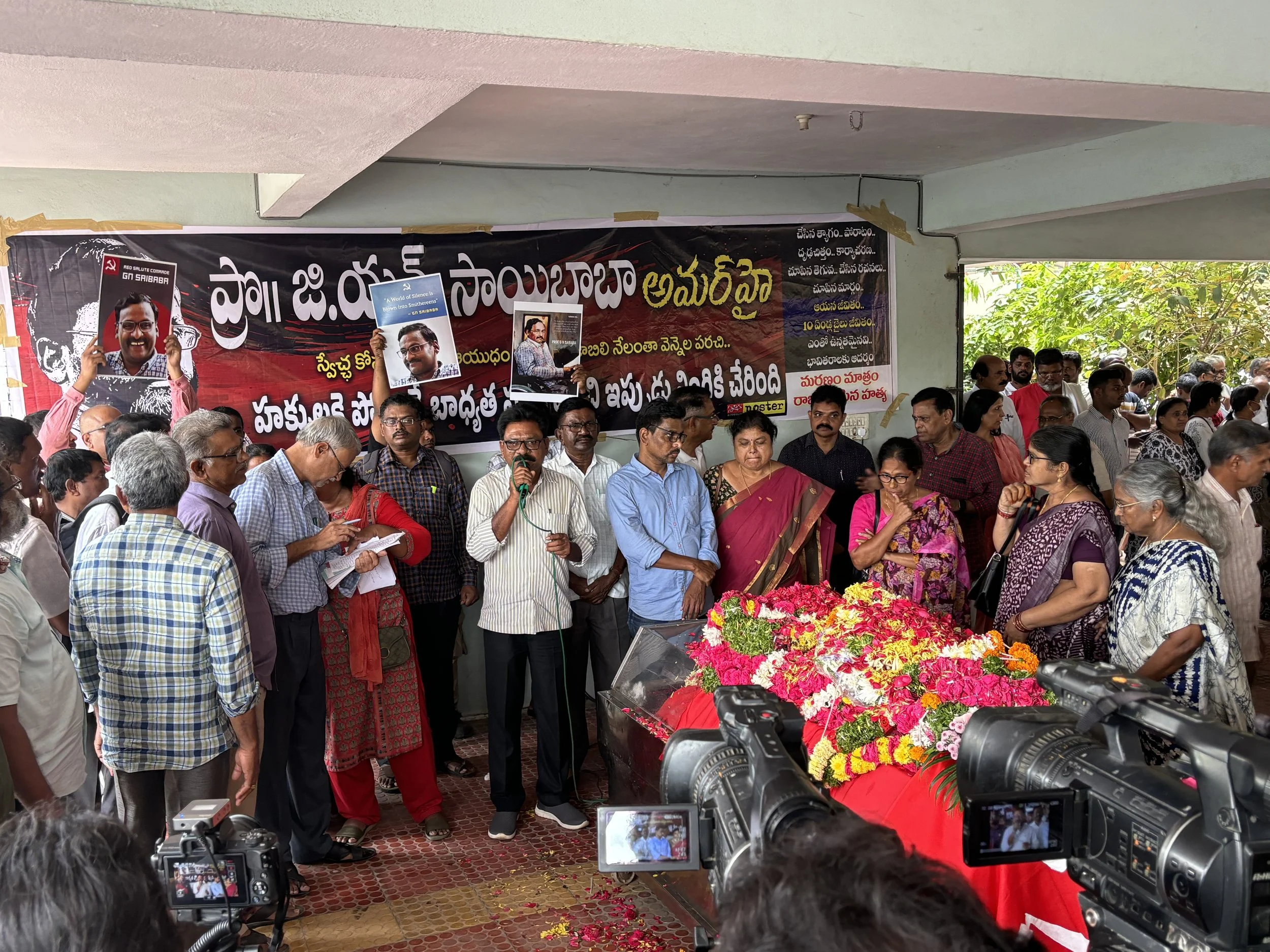 People calling out ‘Red Salute’, ‘Lal Salaam’ and ‘Johar’ as Dr. G.N. Saibaba’s body is handed over to the Medical College.